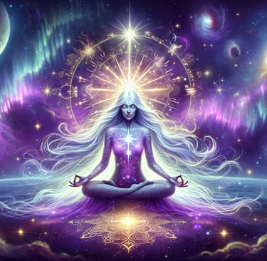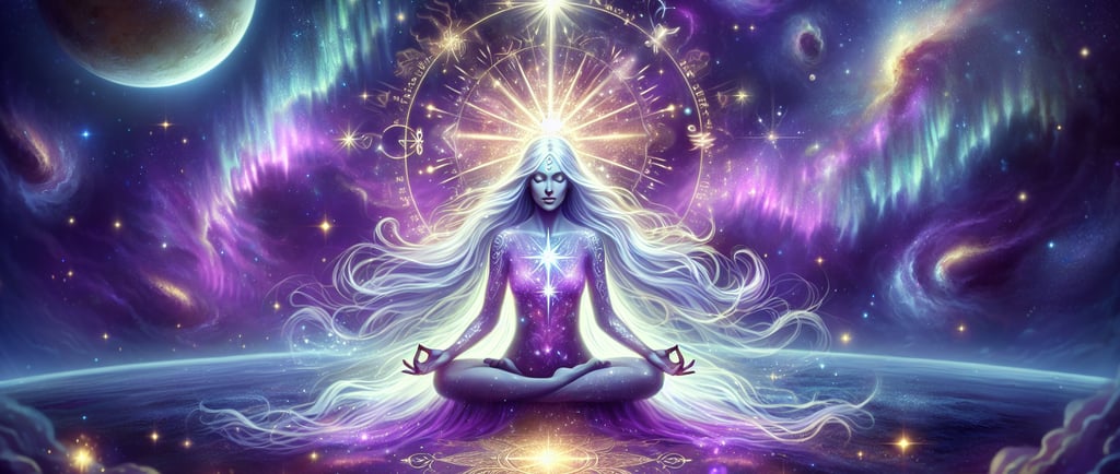 Este centro energético vibra por encima de la coronilla, como una estrella suspendida en el vacío, y es el puente entre tu esencia individual y el plano del alma.